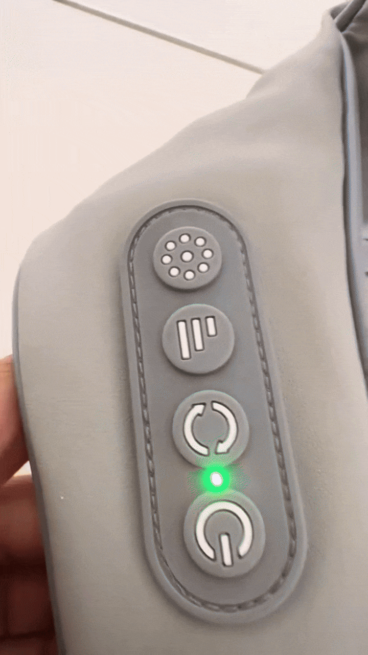 Respuesta 1: El masajeador utiliza un movimiento de amasamiento similar a los nudos, combinado con calor, para relajar los músculos tensos en el cuello y hombros. Solo tienes que colocártelo sobre los hombros, encenderlo y seleccionar la intensidad deseada.